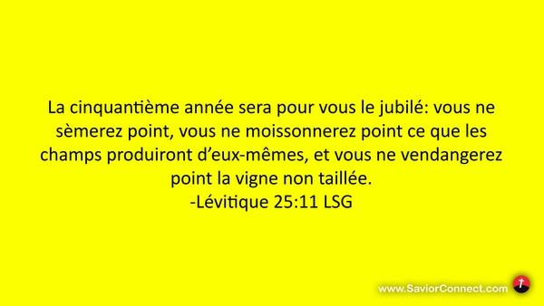 La cinquantième année sera pour vous le jubilé: vous ne sèmerez point, vous ne moissonnerez point ce que les champs produiront d'eux-mêmes, et vous ne vendangerez point la vigne non taillée. -Lévitique 25:11 LSG