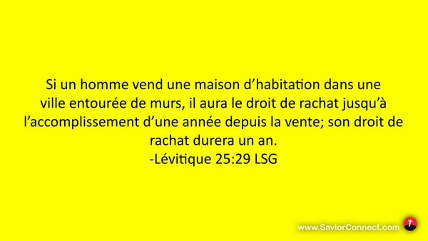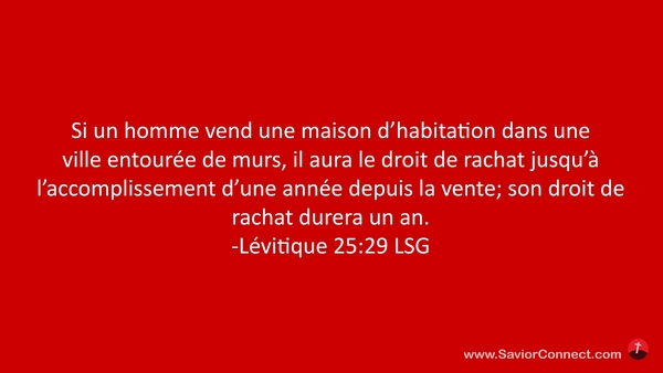 Si un homme vend une maison d'habitation dans une ville entourée de murs, il aura le droit de rachat jusqu'à l'accomplissement d'une année depuis la vente; son droit de rachat durera un an. -Lévitique 25:29 LSG