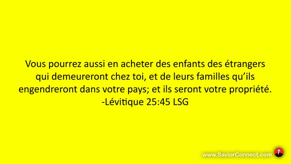Vous pourrez aussi en acheter des enfants des étrangers qui demeureront chez toi, et de leurs familles qu'ils engendreront dans votre pays; et ils seront votre propriété. -Lévitique 25:45 LSG
