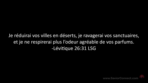 Je réduirai vos villes en déserts, je ravagerai vos sanctuaires, et je ne respirerai plus l'odeur agréable de vos parfums. -Lévitique 26:31 LSG