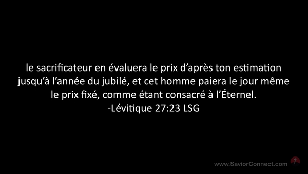 le sacrificateur en évaluera le prix d'après ton estimation jusqu'à l'année du jubilé, et cet homme paiera le jour même le prix fixé, comme étant consacré à l'Éternel. -Lévitique 27:23 LSG