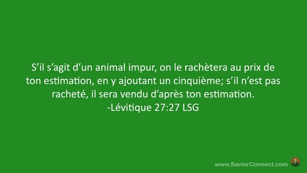 S'il s'agit d'un animal impur, on le rachètera au prix de ton estimation, en y ajoutant un cinquième; s'il n'est pas racheté, il sera vendu d'après ton estimation. -Lévitique 27:27 LSG