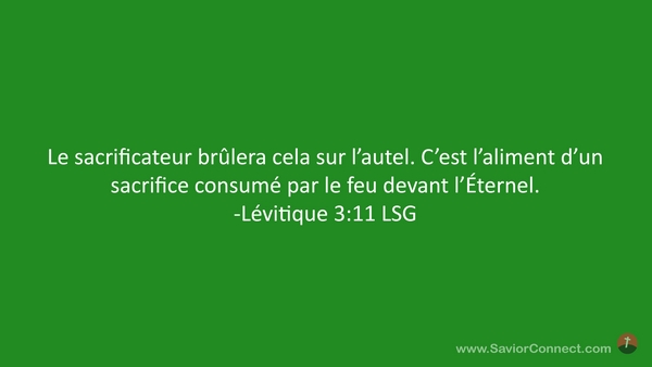 Le sacrificateur brûlera cela sur l'autel. C'est l'aliment d'un sacrifice consumé par le feu devant l'Éternel. -Lévitique 3:11 LSG