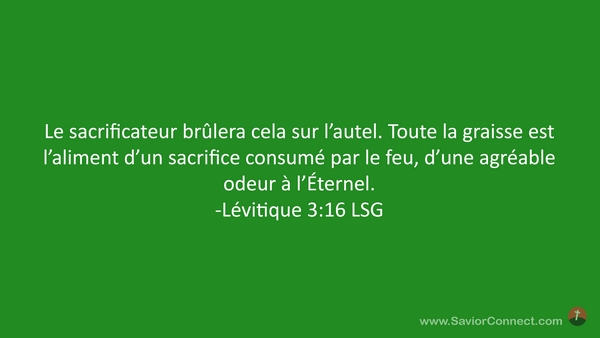 Le sacrificateur brûlera cela sur l'autel. Toute la graisse est l'aliment d'un sacrifice consumé par le feu, d'une agréable odeur à l'Éternel. -Lévitique 3:16 LSG
