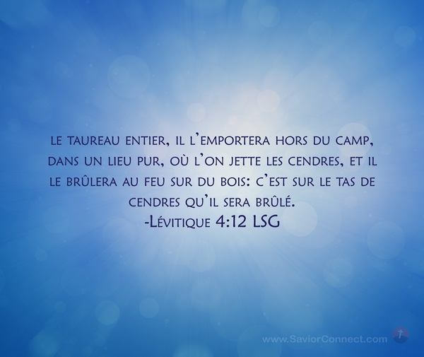 le taureau entier, il l'emportera hors du camp, dans un lieu pur, où l'on jette les cendres, et il le brûlera au feu sur du bois: c'est sur le tas de cendres qu'il sera brûlé. -Lévitique 4:12 LSG