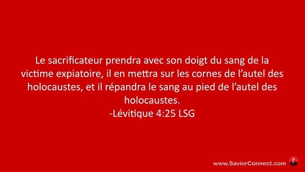 Le sacrificateur prendra avec son doigt du sang de la victime expiatoire, il en mettra sur les cornes de l'autel des holocaustes, et il répandra le sang au pied de l'autel des holocaustes. -Lévitique 4:25 LSG