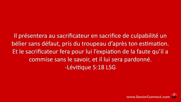 Il présentera au sacrificateur en sacrifice de culpabilité un bélier sans défaut, pris du troupeau d'après ton estimation. Et le sacrificateur fera pour lui l'expiation de la faute qu'il a commise sans le savoir, et il lui sera pardonné. -Lévitique 5:18 LSG