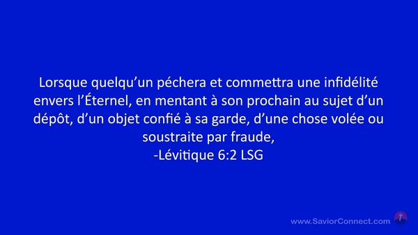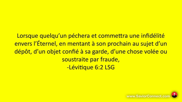 Lorsque quelqu'un péchera et commettra une infidélité envers l'Éternel, en mentant à son prochain au sujet d'un dépôt, d'un objet confié à sa garde, d'une chose volée ou soustraite par fraude, -Lévitique 6:2 LSG