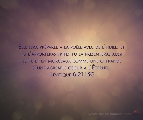 Elle sera préparée à la poêle avec de l'huile, et tu l'apporteras frite; tu la présenteras aussi cuite et en morceaux comme une offrande d'une agréable odeur à l'Éternel. -Lévitique 6:21 LSG