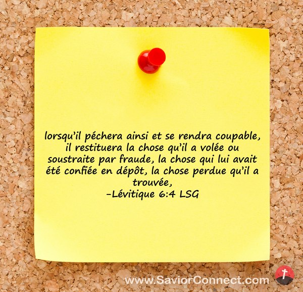 lorsqu'il péchera ainsi et se rendra coupable, il restituera la chose qu'il a volée ou soustraite par fraude, la chose qui lui avait été confiée en dépôt, la chose perdue qu'il a trouvée, -Lévitique 6:4 LSG