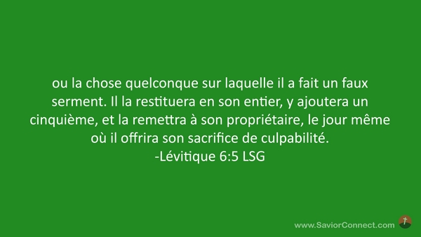 ou la chose quelconque sur laquelle il a fait un faux serment. Il la restituera en son entier, y ajoutera un cinquième, et la remettra à son propriétaire, le jour même où il offrira son sacrifice de culpabilité. -Lévitique 6:5 LSG