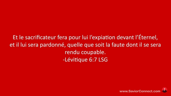 Et le sacrificateur fera pour lui l'expiation devant l'Éternel, et il lui sera pardonné, quelle que soit la faute dont il se sera rendu coupable. -Lévitique 6:7 LSG