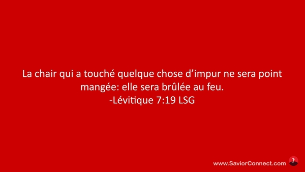 La chair qui a touché quelque chose d'impur ne sera point mangée: elle sera brûlée au feu. -Lévitique 7:19 LSG