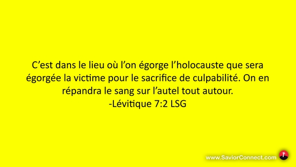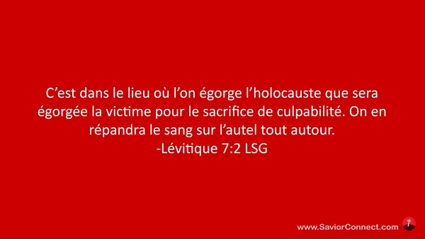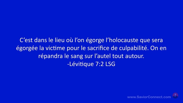 C'est dans le lieu où l'on égorge l'holocauste que sera égorgée la victime pour le sacrifice de culpabilité. On en répandra le sang sur l'autel tout autour. -Lévitique 7:2 LSG