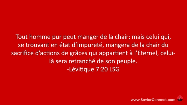 Tout homme pur peut manger de la chair; mais celui qui, se trouvant en état d'impureté, mangera de la chair du sacrifice d'actions de grâces qui appartient à l'Éternel, celui-là sera retranché de son peuple. -Lévitique 7:20 LSG