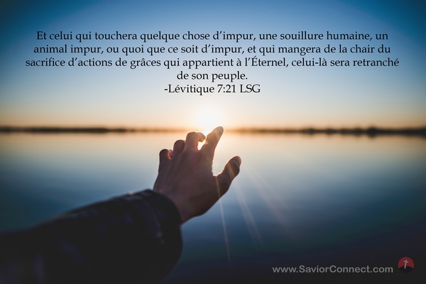 Et celui qui touchera quelque chose d'impur, une souillure humaine, un animal impur, ou quoi que ce soit d'impur, et qui mangera de la chair du sacrifice d'actions de grâces qui appartient à l'Éternel, celui-là sera retranché de son peuple. -Lévitique 7:21 LSG
