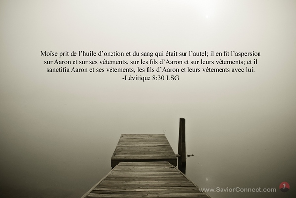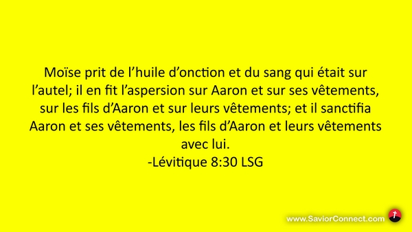 Moïse prit de l'huile d'onction et du sang qui était sur l'autel; il en fit l'aspersion sur Aaron et sur ses vêtements, sur les fils d'Aaron et sur leurs vêtements; et il sanctifia Aaron et ses vêtements, les fils d'Aaron et leurs vêtements avec lui. -Lévitique 8:30 LSG