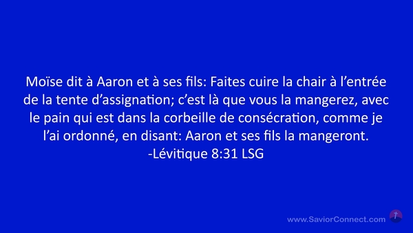 Moïse dit à Aaron et à ses fils: Faites cuire la chair à l'entrée de la tente d'assignation; c'est là que vous la mangerez, avec le pain qui est dans la corbeille de consécration, comme je l'ai ordonné, en disant: Aaron et ses fils la mangeront. -Lévitique 8:31 LSG