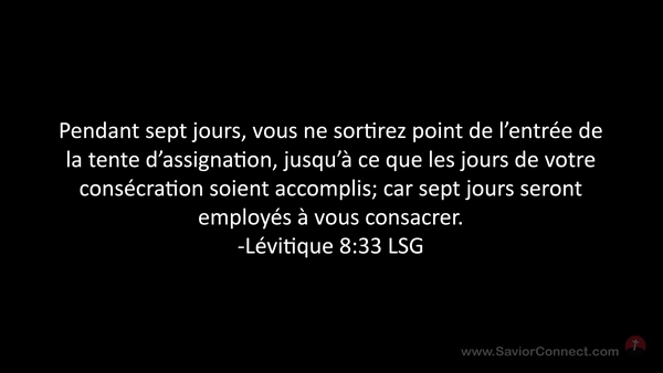 Pendant sept jours, vous ne sortirez point de l'entrée de la tente d'assignation, jusqu'à ce que les jours de votre consécration soient accomplis; car sept jours seront employés à vous consacrer. -Lévitique 8:33 LSG
