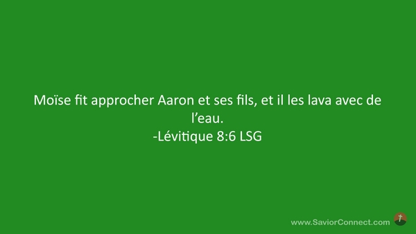 Moïse fit approcher Aaron et ses fils, et il les lava avec de l'eau. -Lévitique 8:6 LSG
