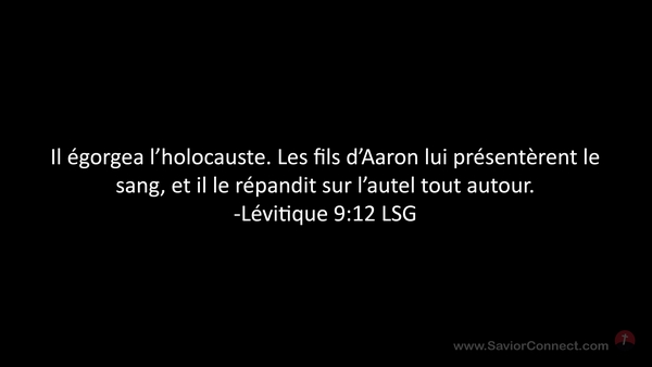 Il égorgea l'holocauste. Les fils d'Aaron lui présentèrent le sang, et il le répandit sur l'autel tout autour. -Lévitique 9:12 LSG