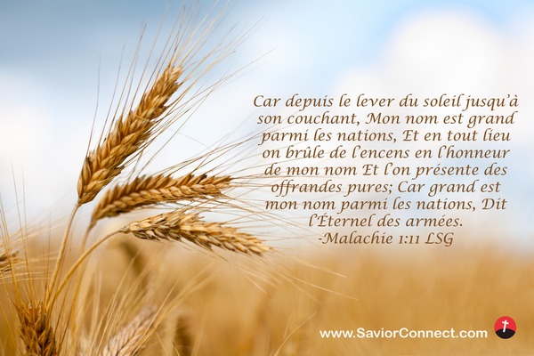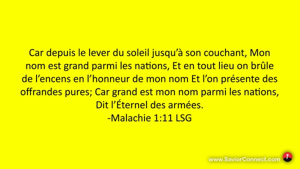 Car depuis le lever du soleil jusqu'à son couchant, Mon nom est grand parmi les nations, Et en tout lieu on brûle de l'encens en l'honneur de mon nom Et l'on présente des offrandes pures; Car grand est mon nom parmi les nations, Dit l'Éternel des armées. -Malachie 1:11 LSG