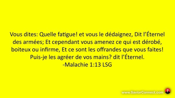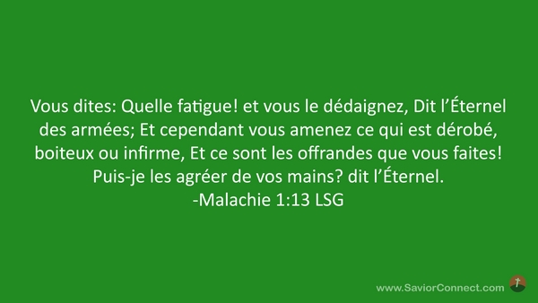 Vous dites: Quelle fatigue! et vous le dédaignez, Dit l'Éternel des armées; Et cependant vous amenez ce qui est dérobé, boiteux ou infirme, Et ce sont les offrandes que vous faites! Puis-je les agréer de vos mains? dit l'Éternel. -Malachie 1:13 LSG