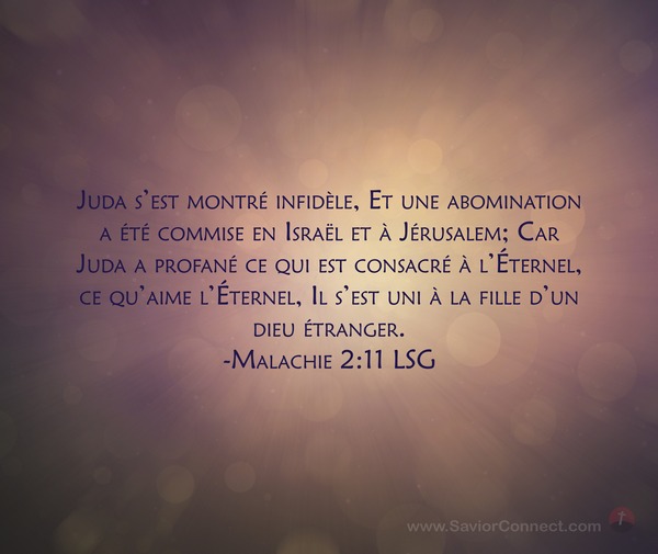 Juda s'est montré infidèle, Et une abomination a été commise en Israël et à Jérusalem; Car Juda a profané ce qui est consacré à l'Éternel, ce qu'aime l'Éternel, Il s'est uni à la fille d'un dieu étranger. -Malachie 2:11 LSG