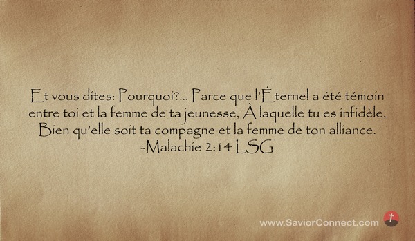 Et vous dites: Pourquoi?... Parce que l'Éternel a été témoin entre toi et la femme de ta jeunesse, À laquelle tu es infidèle, Bien qu'elle soit ta compagne et la femme de ton alliance. -Malachie 2:14 LSG