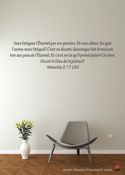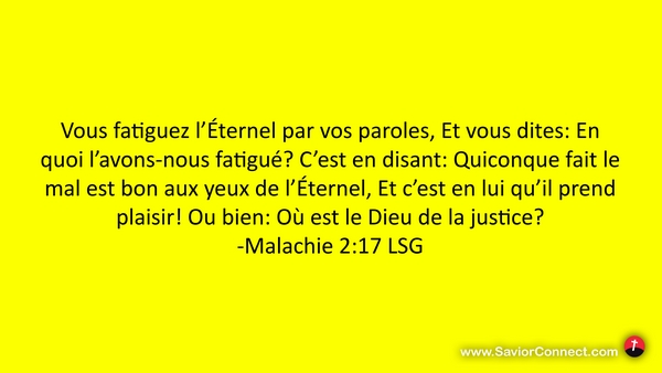 Vous fatiguez l'Éternel par vos paroles, Et vous dites: En quoi l'avons-nous fatigué? C'est en disant: Quiconque fait le mal est bon aux yeux de l'Éternel, Et c'est en lui qu'il prend plaisir! Ou bien: Où est le Dieu de la justice? -Malachie 2:17 LSG