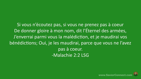 Si vous n'écoutez pas, si vous ne prenez pas à coeur De donner gloire à mon nom, dit l'Éternel des armées, J'enverrai parmi vous la malédiction, et je maudirai vos bénédictions; Oui, je les maudirai, parce que vous ne l'avez pas à coeur. -Malachie 2:2 LSG