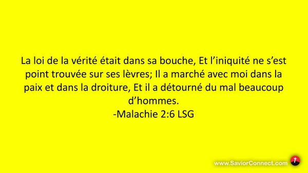 La loi de la vérité était dans sa bouche, Et l'iniquité ne s'est point trouvée sur ses lèvres; Il a marché avec moi dans la paix et dans la droiture, Et il a détourné du mal beaucoup d'hommes. -Malachie 2:6 LSG