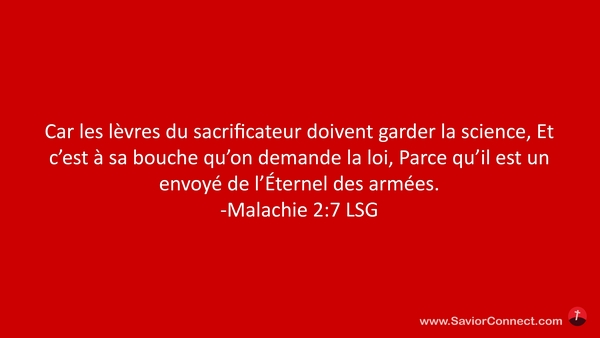 Car les lèvres du sacrificateur doivent garder la science, Et c'est à sa bouche qu'on demande la loi, Parce qu'il est un envoyé de l'Éternel des armées. -Malachie 2:7 LSG