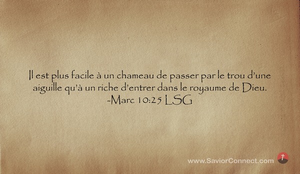 Il est plus facile à un chameau de passer par le trou d'une aiguille qu'à un riche d'entrer dans le royaume de Dieu. -Marc 10:25 LSG