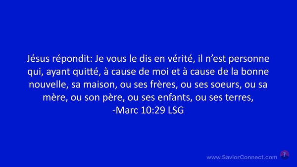 Jésus répondit: Je vous le dis en vérité, il n'est personne qui, ayant quitté, à cause de moi et à cause de la bonne nouvelle, sa maison, ou ses frères, ou ses soeurs, ou sa mère, ou son père, ou ses enfants, ou ses terres, -Marc 10:29 LSG
