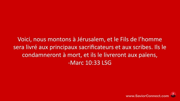 Voici, nous montons à Jérusalem, et le Fils de l'homme sera livré aux principaux sacrificateurs et aux scribes. Ils le condamneront à mort, et ils le livreront aux païens, -Marc 10:33 LSG