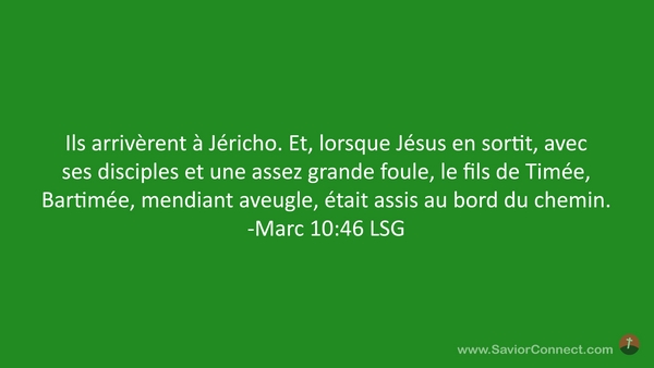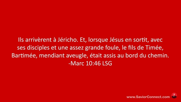 Ils arrivèrent à Jéricho. Et, lorsque Jésus en sortit, avec ses disciples et une assez grande foule, le fils de Timée, Bartimée, mendiant aveugle, était assis au bord du chemin. -Marc 10:46 LSG