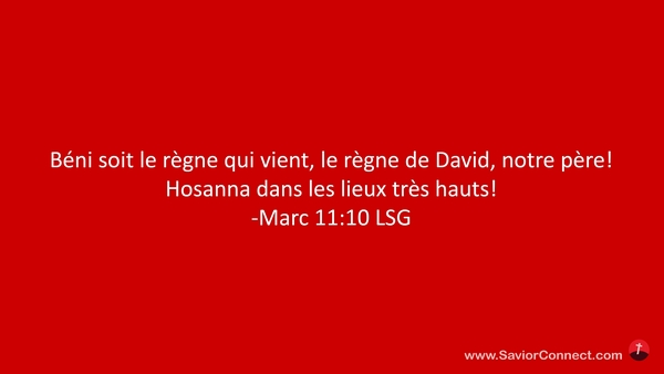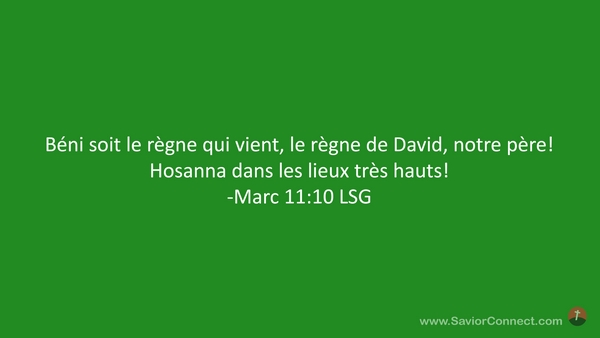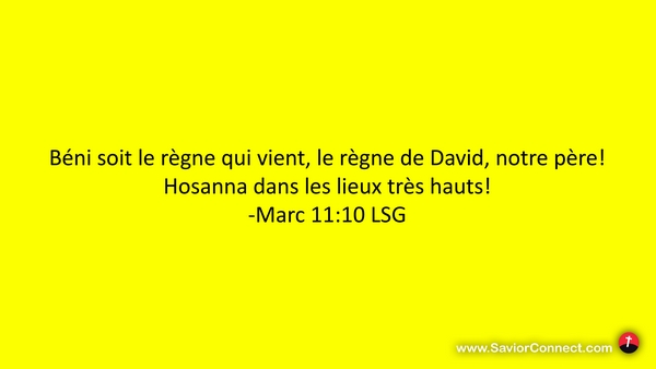 Béni soit le règne qui vient, le règne de David, notre père! Hosanna dans les lieux très hauts! -Marc 11:10 LSG