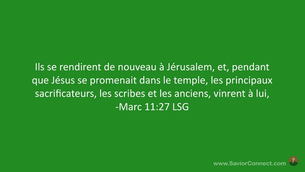 Ils se rendirent de nouveau à Jérusalem, et, pendant que Jésus se promenait dans le temple, les principaux sacrificateurs, les scribes et les anciens, vinrent à lui, -Marc 11:27 LSG