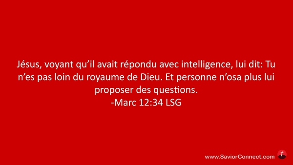 Jésus, voyant qu'il avait répondu avec intelligence, lui dit: Tu n'es pas loin du royaume de Dieu. Et personne n'osa plus lui proposer des questions. -Marc 12:34 LSG