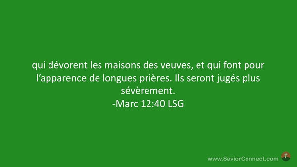 qui dévorent les maisons des veuves, et qui font pour l'apparence de longues prières. Ils seront jugés plus sévèrement. -Marc 12:40 LSG