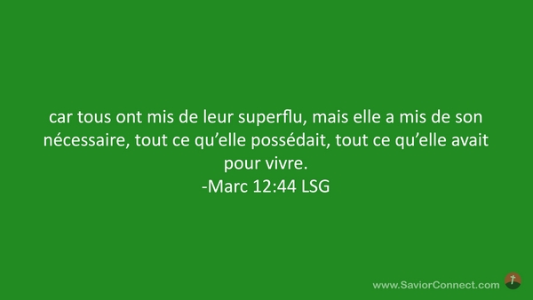 car tous ont mis de leur superflu, mais elle a mis de son nécessaire, tout ce qu'elle possédait, tout ce qu'elle avait pour vivre. -Marc 12:44 LSG