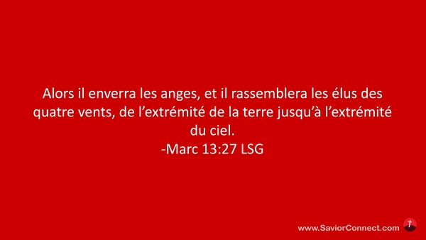 Alors il enverra les anges, et il rassemblera les élus des quatre vents, de l'extrémité de la terre jusqu'à l'extrémité du ciel. -Marc 13:27 LSG