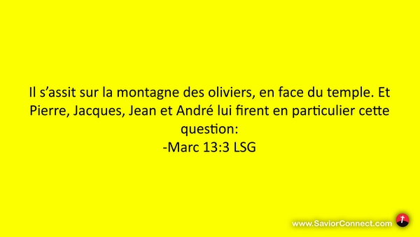 Il s'assit sur la montagne des oliviers, en face du temple. Et Pierre, Jacques, Jean et André lui firent en particulier cette question: -Marc 13:3 LSG