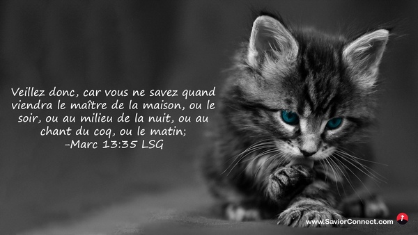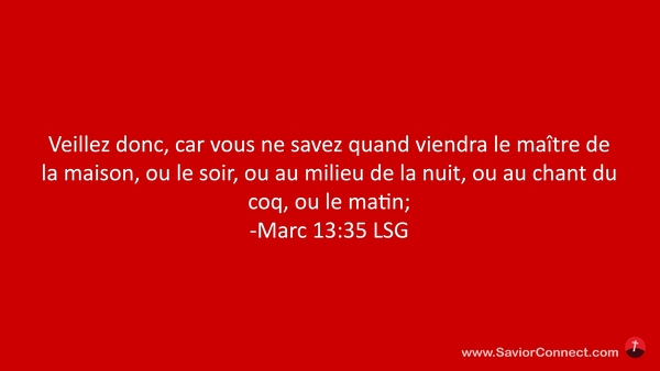 Veillez donc, car vous ne savez quand viendra le maître de la maison, ou le soir, ou au milieu de la nuit, ou au chant du coq, ou le matin; -Marc 13:35 LSG