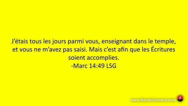 J'étais tous les jours parmi vous, enseignant dans le temple, et vous ne m'avez pas saisi. Mais c'est afin que les Écritures soient accomplies. -Marc 14:49 LSG