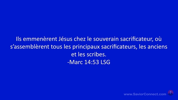 Ils emmenèrent Jésus chez le souverain sacrificateur, où s'assemblèrent tous les principaux sacrificateurs, les anciens et les scribes. -Marc 14:53 LSG