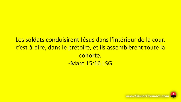 Les soldats conduisirent Jésus dans l'intérieur de la cour, c'est-à-dire, dans le prétoire, et ils assemblèrent toute la cohorte. -Marc 15:16 LSG