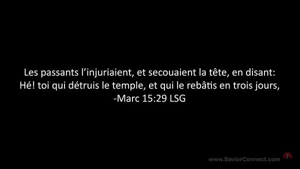 Les passants l'injuriaient, et secouaient la tête, en disant: Hé! toi qui détruis le temple, et qui le rebâtis en trois jours, -Marc 15:29 LSG