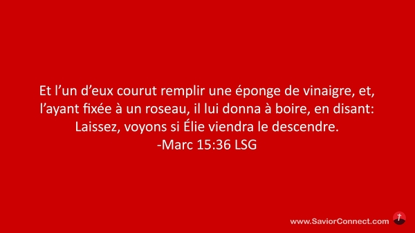 Et l'un d'eux courut remplir une éponge de vinaigre, et, l'ayant fixée à un roseau, il lui donna à boire, en disant: Laissez, voyons si Élie viendra le descendre. -Marc 15:36 LSG